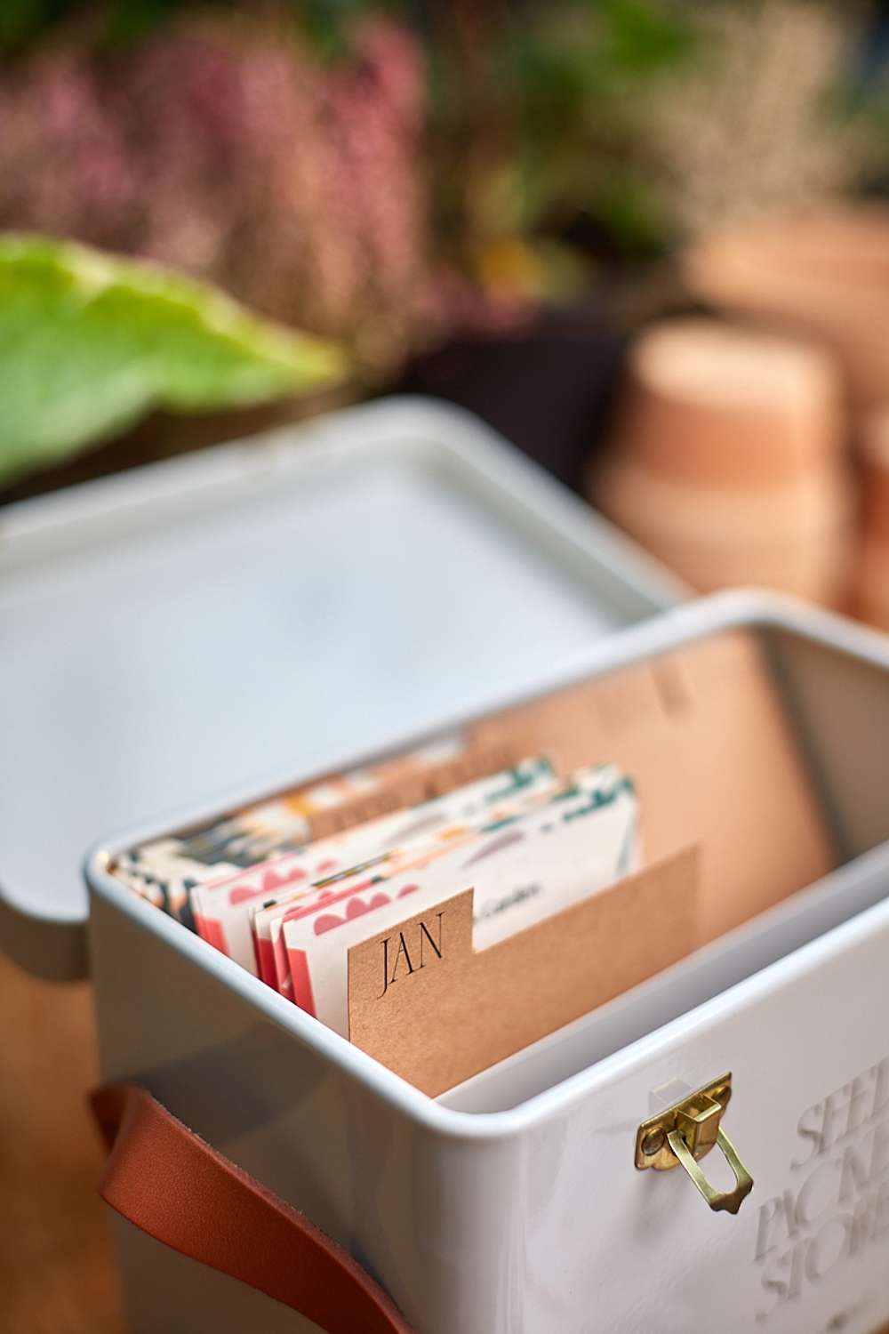 Men udover at være smuk er denne frødåse også yderst praktisk. To stærke metalklemmer holder det hængslede låg sikkert lukket, og indeni findes tre separate rum, der gør det nemt at organisere frøene klar til såning. Ét af rummene løber endda på langs, så selv de største frøposer har plads. Der medfølger månedskort, så du kan holde styr på, hvornår dine frø skal sås.