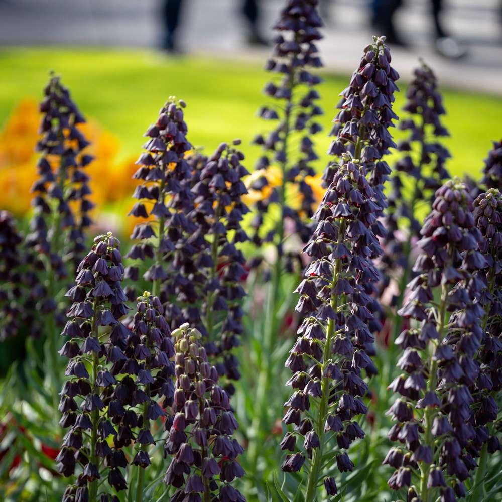 Fritillaria persica er en dramatisk og arkitektonisk løgplante, der blomstrer i april med imponerende spir af klokkeformede blomster i dybe, purpurbrune til næsten sorte nuancer. Den majestætiske blomsterstand kan nå op til en meter i højden og bærer ofte over 20 nikkende blomster, som sidder tæt langs stænglen og skaber en slank, elegant silhuet. Løvet er blågrønt og voksagtigt, hvilket giver en smuk kontrast til de mørke blomster og understreger plantens skulpturelle udtryk. Fritillaria persica bringer et eksotisk og næsten gotisk præg til forårshaven og gør sig særligt godt som kontrast til lysere tulipaner eller i kombination med andre løgplanter i dæmpede toner.