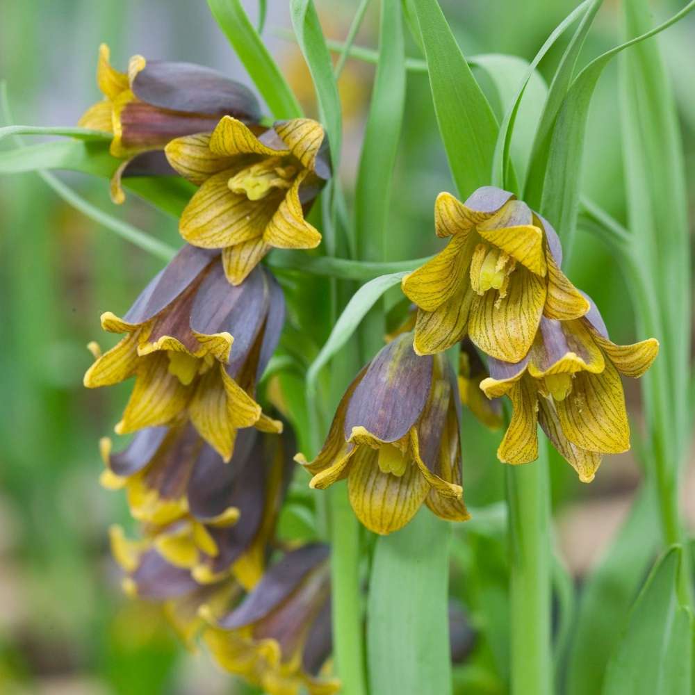 Fritillaria uva-vulpis er en yndefuld og underspillet forårsløgplante, der blomstrer i april med slanke, nikkende klokker i dybe, metalliske nuancer. Hver blomst har en fløjlsagtig, mørklilla yderside med et tydeligt olivengyldent skær langs kanten og i spidsen, hvilket giver den et raffineret, næsten antikt udtryk. Den indre farve er varm gul, som skimtes diskret, når blomsten vipper i vinden. Planten har smalt, blågrønt løv og en let, elegant vækstform, der gør den perfekt til naturalisering i græs eller til plantning mellem tidlige stauder. Fritillaria uva-vulpis bringer et strejf af vild, botanisk poesi til haven og blomstrer diskret, men uforglemmeligt.