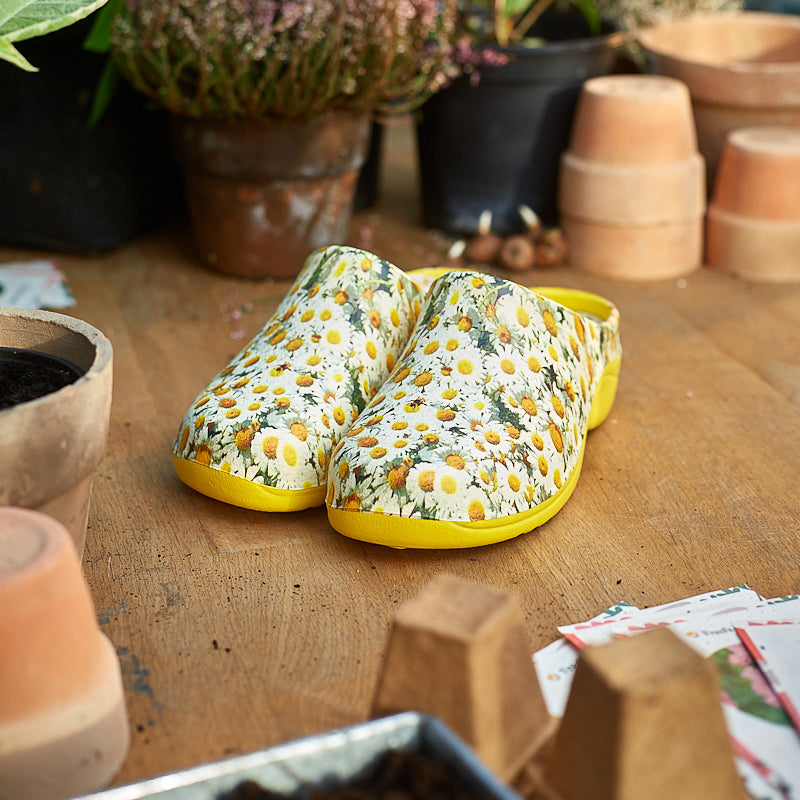 Komfortable havesko fra Backdoorshoes med et skønt design, af utallige margueritter/tusindfryd, med en knaldgul sål.