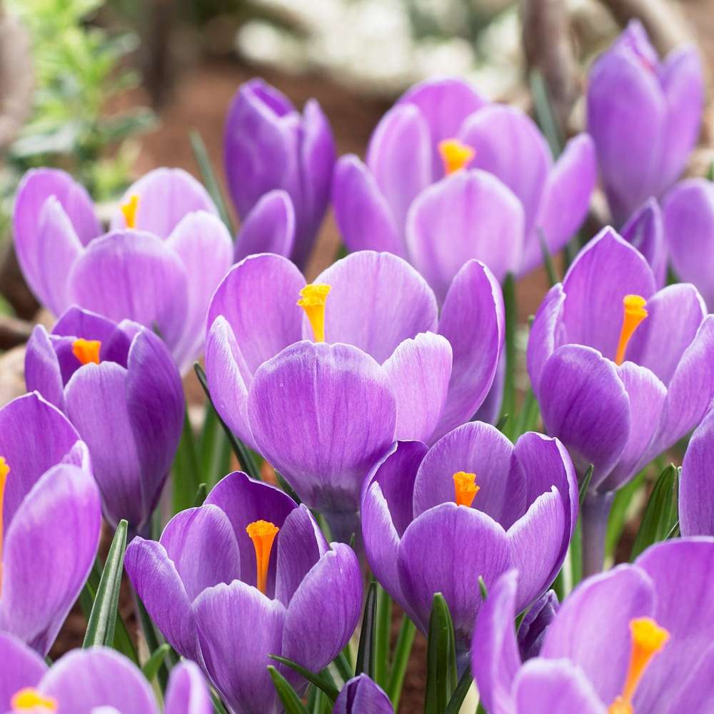 ‘Grand Maitre’ er en klassisk storblomstrende krokus med brede, silkebløde kronblade i en afdæmpet lavendellilla tone. Farven varierer let med lyset – fra grålig violet til klar syrén – og midten er prydet af stærke orange støvdragere, der skaber et levende farvespil.