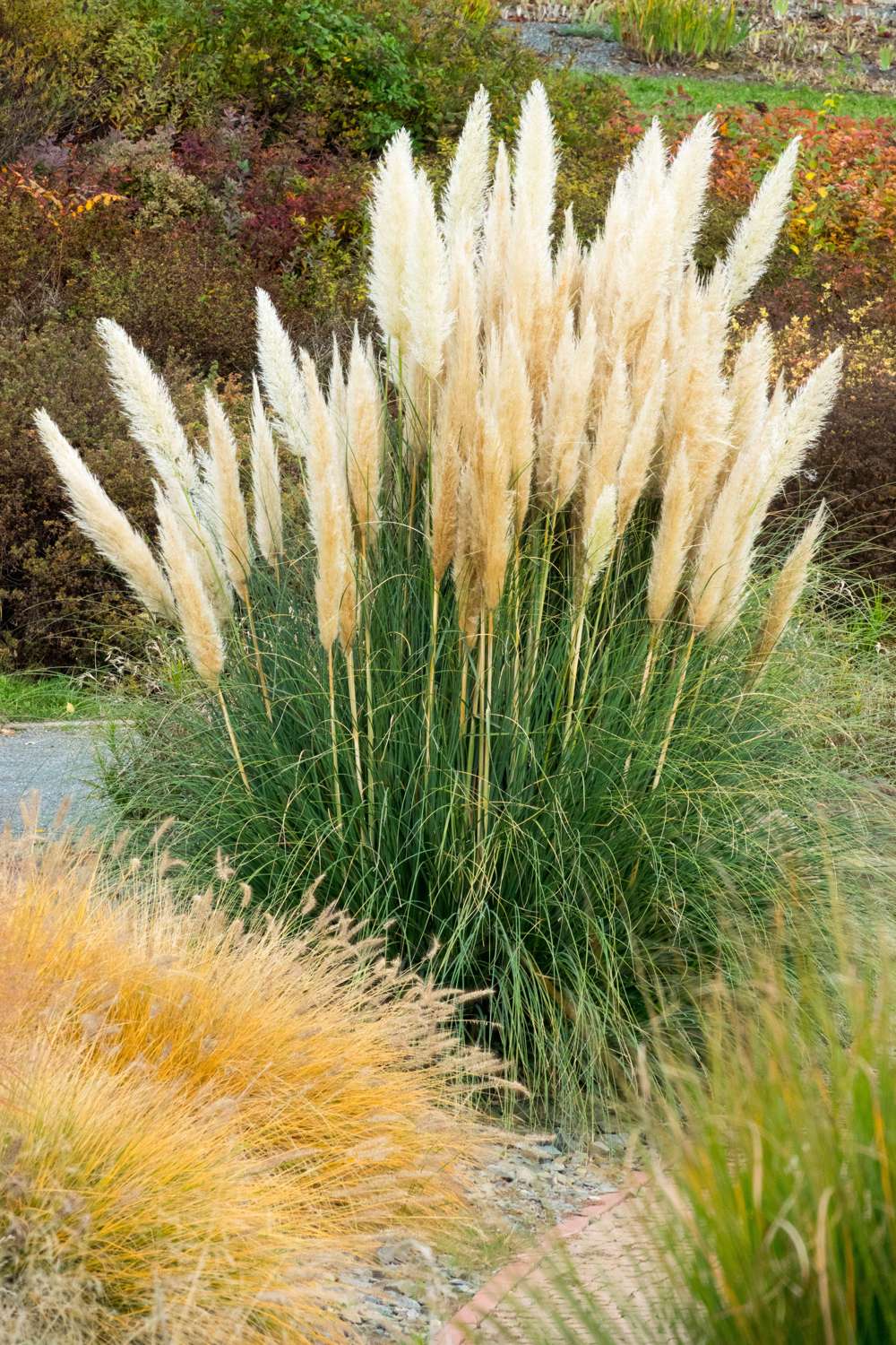 Pampasgræs har høje, fjerlette fjer, der rejser sig over det frodige, buede løv og skaber et fantastisk fokuspunkt i haver og landskaber. Dette hårdføre prydgræs trives i fuld sol og veldrænet jord og er perfekt til at give højde og struktur. Dens bløde, sølvhvide fjer svajer yndefuldt i vinden og er ideel til kanter, tørrede arrangementer eller som statement-plante.