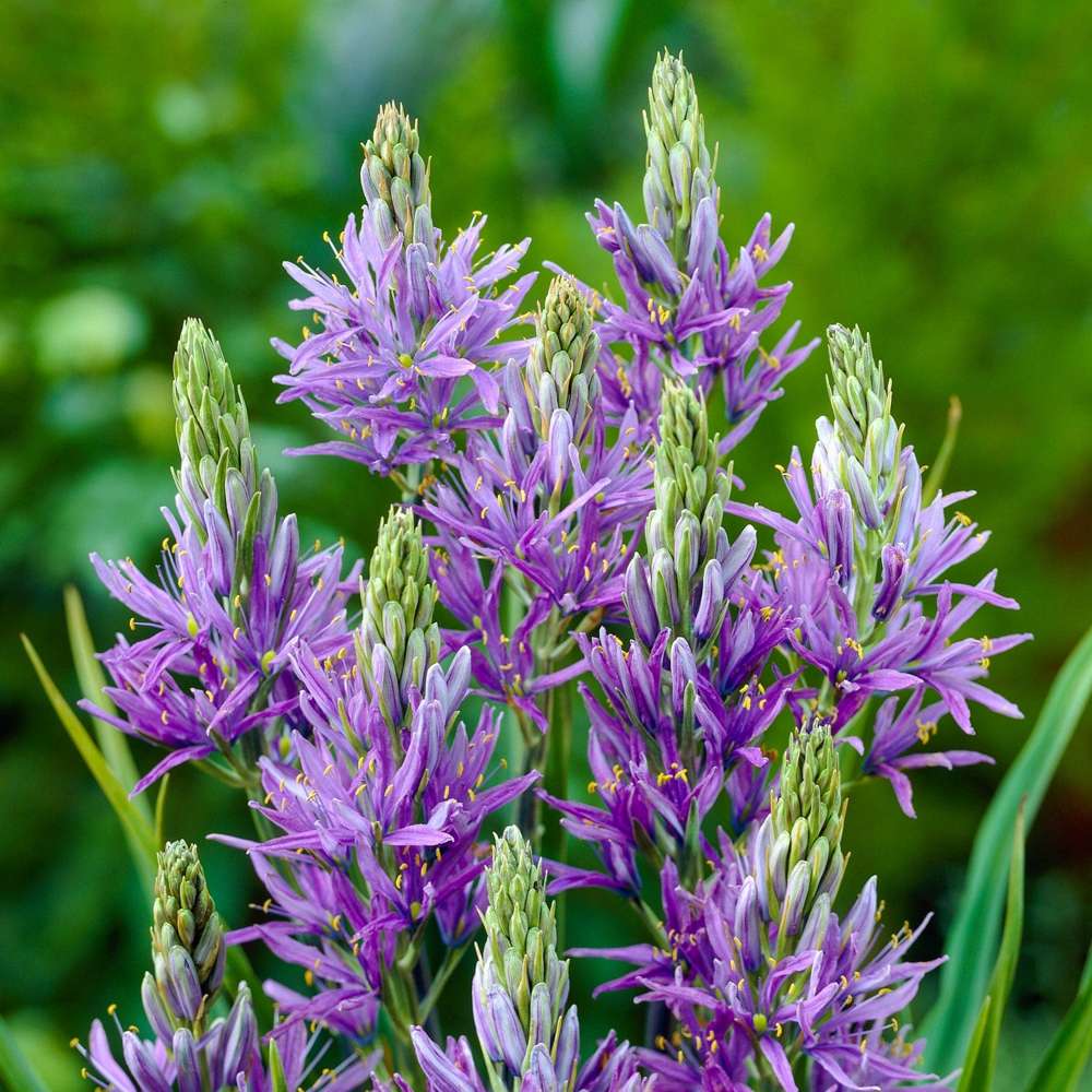 Camassia quamash er lidt lavere end sin slægtning leichtlinii, typisk omkring 30–50 cm høj, og har en mere naturlig og vildtvoksende karakter. Den passer perfekt i staudebede, skovbryn og blomsterenge, hvor den let kan forvildes og komme igen år efter år. Løvet er smalt, græsagtigt og grønt – diskret, men smukt som base for blomstringens spil.