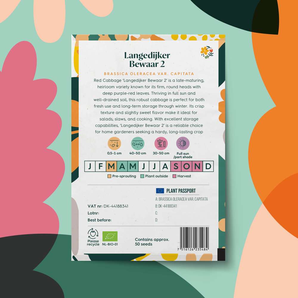Rødkål 'Langedijker Bewaar 2' er en sent modnende arvesort, der er kendt for sine faste, runde hoveder med dybt purpurrøde blade. Denne robuste kål trives i fuld sol og veldrænet jord og er perfekt til både frisk brug og langtidsopbevaring gennem vinteren. Dens sprøde konsistens og let søde smag gør den ideel til salater og madlavning. Med fremragende opbevaringsegenskaber er 'Langedijker Bewaar 2' et pålideligt valg for hjemmedyrkere, der søger en hårdfør, langtidsholdbar afgrøde.