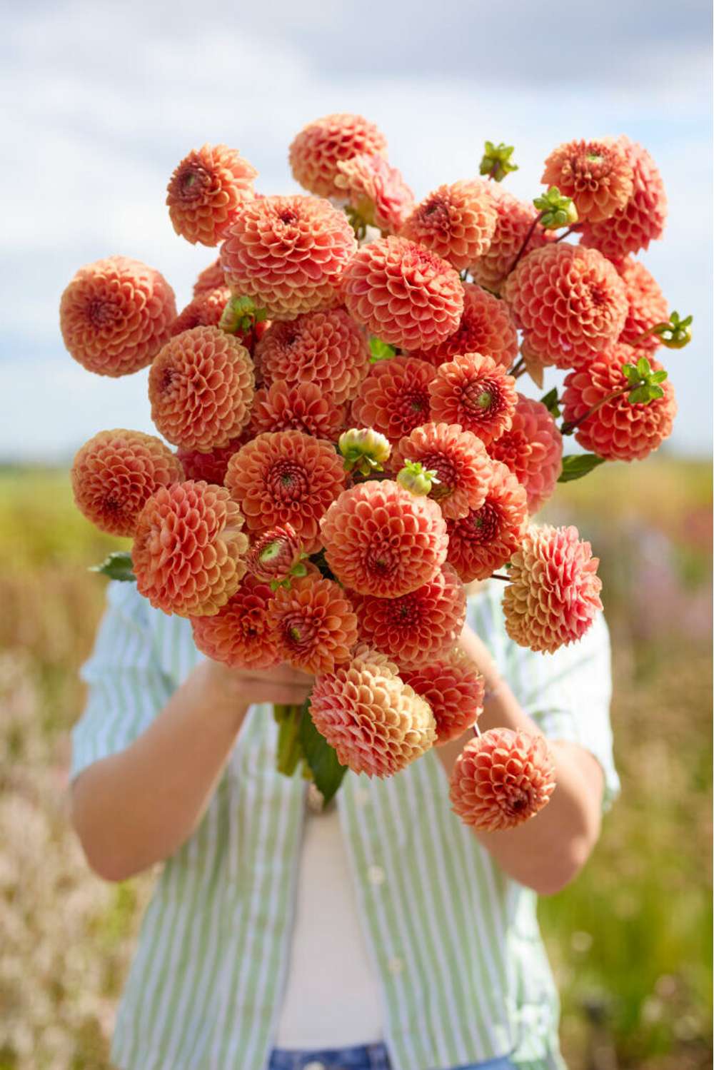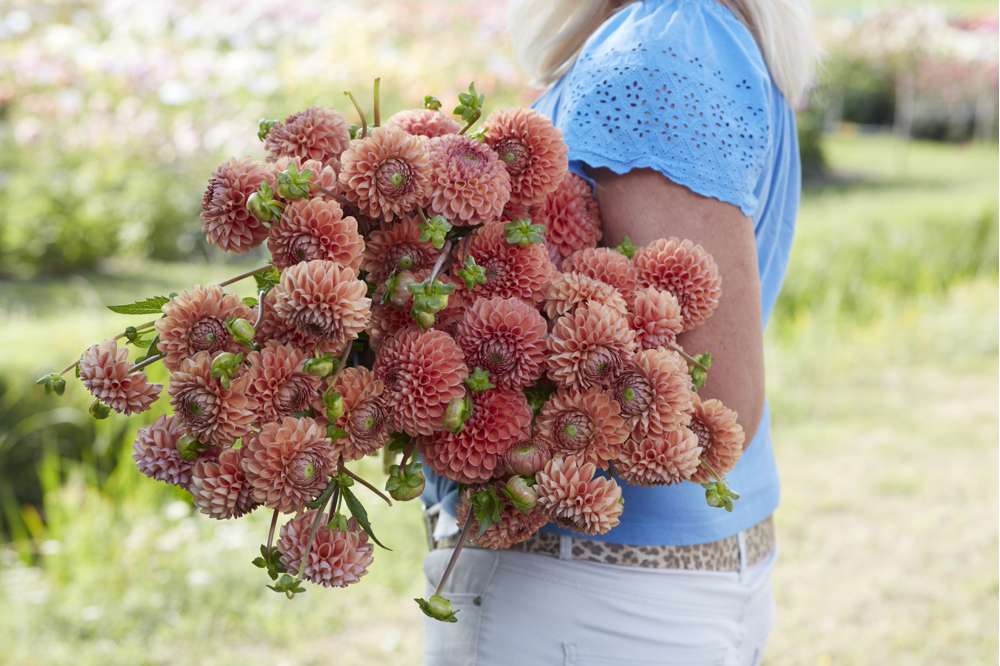 Dahlia 'Cornel Brons' er en bedårende repræsentant for ball dahlia-familien, der stråler med en blanding af blid pink og blød fersken, der bliver bronzefarvet mod centrum. De tætte blomsterhoveder bliver ca. 7-10 cm i diameter og er næsten kugleformede. Med en højde på omkring 90 cm, står 'Cornel Brons' stolt i haven og blomstrer rigeligt fra midtsommer indtil den første frost. Den er god både i bede, store krukker og blomsterkasser. Husk endelig at plukke til buketter og dekorationer. Jo flere du plukker, jo flere knopper vil planten forkæle dig med.