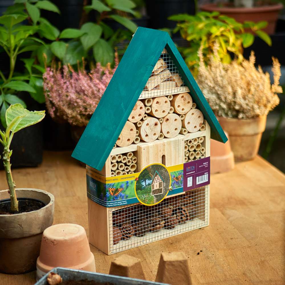 Hotellet består af flere forskellige kamre og naturmaterialer, der hver især tilgodeser forskellige insektarter. Resultatet er en aktiv og varieret insektfauna, som gavner alt fra blomster til grøntsagsbede.