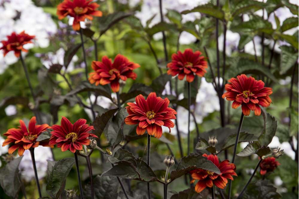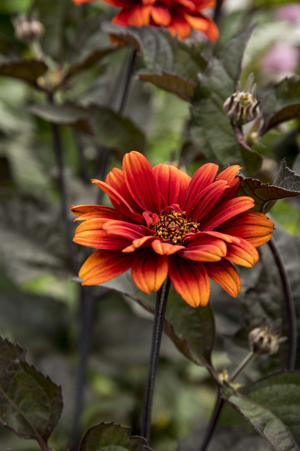 Soldagøje 'Blødende hjerter' (Heliopsis helianthoides var. scabra 'Bleeding Hearts') er en betagende staude, der lyser haven op med sine intense blomsterfarver og dramatiske løv. Blomsterne skifter farve fra dyb orange-rød til en varm bronzetone, hvilket skaber et dynamisk farvespil gennem sæsonen. Planten når en højde på op til 120 cm og er en imponerende baggrundsplante i staudebede eller som et blikfang i solrige haver.