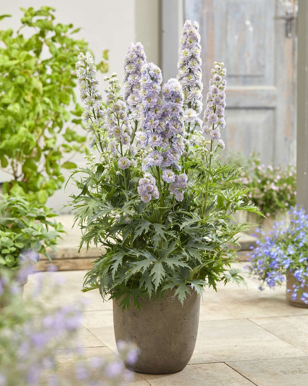 Ridderspore ‘Highlander Rainbow Sensation’ er en imponerende variant, der skiller sig ud med sine store, dobbelte blomster i en betagende farvekombination af pasteller - blød rosa, lavendel, cremehvid og gul. De fløjlsagtige blomster sidder tæt på høje, oprette spir og skaber et farverigt og elegant udtryk i haven. Denne sort blomstrer fra forsommer til sensommer og tiltrækker bier og sommerfugle med sine nektarrige blomster.