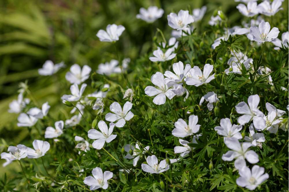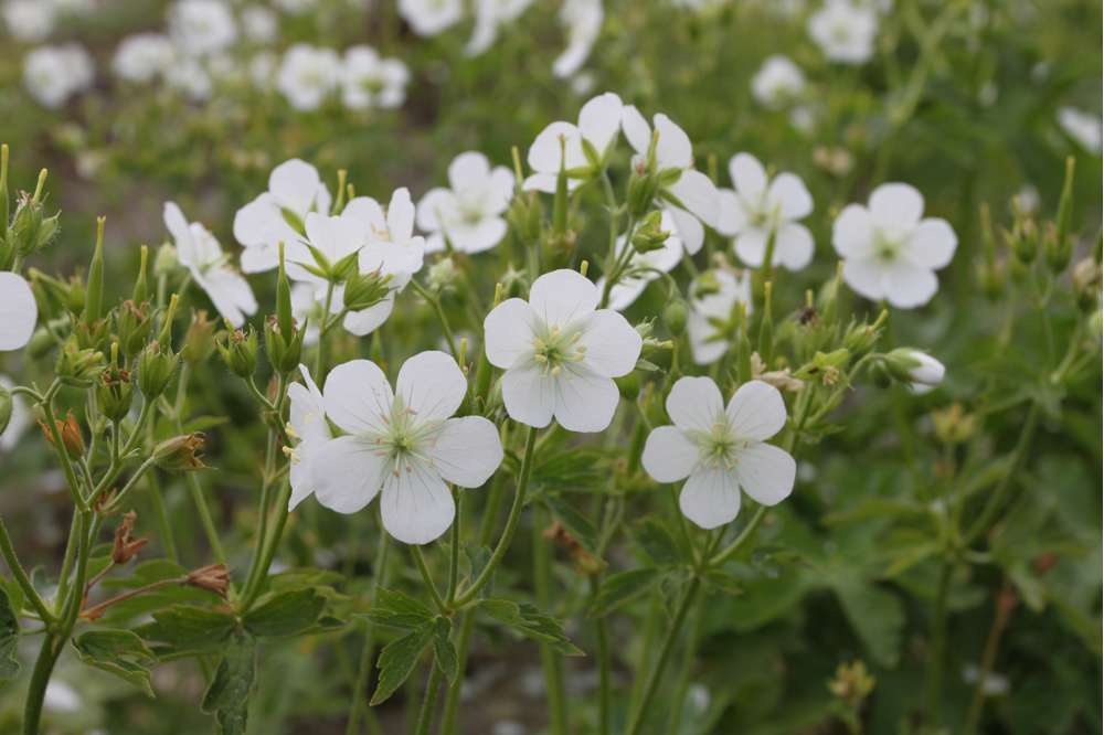 Storkenæb ‘Album’ er en yndefuld og alsidig staude, der pryder haven med sine enkle, hvide blomster, som tilfører et rent og elegant udtryk. Blomsterne svæver let over det frodige, grønne løv og blomstrer fra forsommer til sensommer. ‘Album’ trives i både sol og halvskygge og foretrækker veldrænet jord, hvilket gør den ideel som bunddække, kantplante eller i blomsterbede. Denne sort er kendt for sin hårdførhed og evne til at tilpasse sig forskellige haveforhold, samtidig med at den skaber en rolig og harmonisk atmosfære.